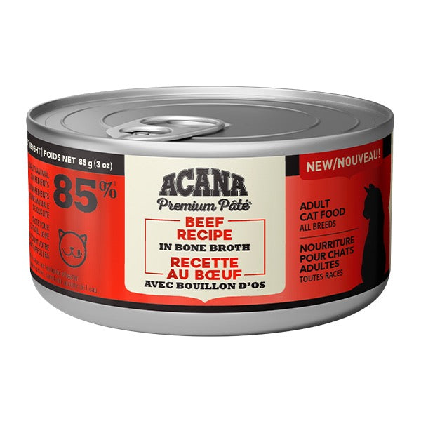 Canadian Brand. ACANA recipes are thoughtfully crafted from start to finish with delicious, quality ingredients. ACANA Premium Paté Beef Recipe in Bone Broth is specially crafted to nourish your cat with 85% quality animal ingredients. This premium pate also includes savoury bone broth that provides the added hydration your cat needs, as well as a burst of delicious flavour in every bite. Rich with quality raw animal ingredients, ACANA Premium Paté satisfies your cat completely with the animal protein they crave.