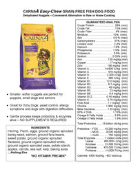 Carna4 Easy-Chew Fish variety is whole food nutrition for all life stages of your dog customized with a slightly softer, smaller nugget – perfect for the little mouths of puppies and small breeds, as well as older dogs that have trouble with chewing. Carna4’s delicious air-dried nuggets are highly digestible and so densely packed with whole foods that you may need to feed 10-15% less per day than you are used to.
