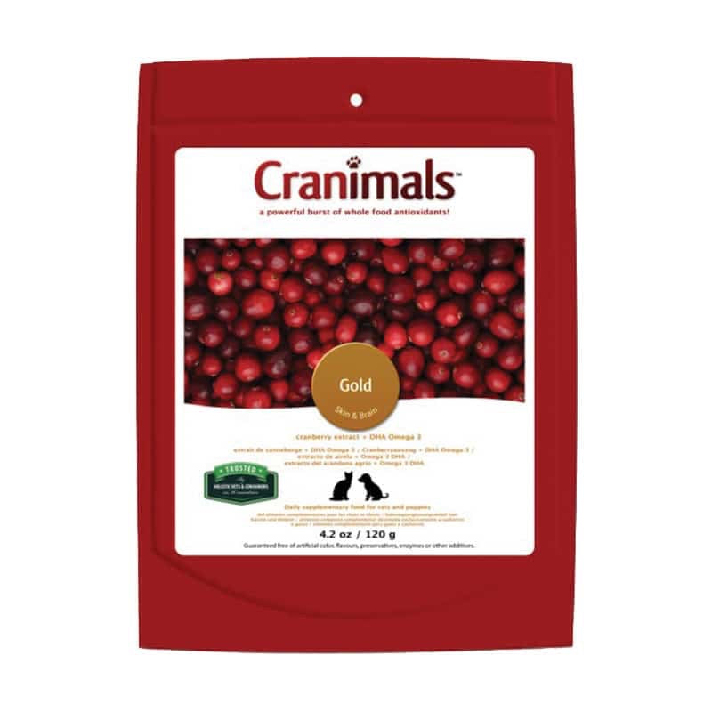 CRANIMALS™ GOLD combines our Original cranberry extract with DHA (Docosahexaenoic Acid), a long chain Omega 3 fatty acid extracted from a sustainable source of microalgae. DHA Omega 3 is a natural anti-inflammatory important for neurological, skin, brain, eye, and heart health in developing puppies and kittens. The Omega 3 in Cranimals Gold is used up by animal metabolism immediately, in contrast to short chain Omega 3 acids (e.g. [ALA] Alpha Linolenic-acid found in flax oil). In fact, it may take up to 37 grams ALA’s (found in flax) to make the same amount of DHA found in 1 gram of Cranimals Gold. CRANIMALS™ Gold contains the antioxidant beta carotene - for healthy eyes, skin, membranes and immune function; choline - for proper cell signalling, mental acuity and joint health; and antioxidant anthocyanidins - for urinary tract health. CRANIMALS™ Gold packs a powerful punch!