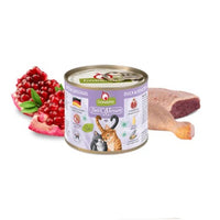Composition: Duck meat and poultry meat 72% (duck 36% muscle meat, heart, stomach; poultry 36% muscle meat, heart, gizzard, liver), duck and poultry broth 24.9%, pomegranate seeds 1%, salmon oil 1%, mineral nutrients 1%, green-lipped mussel 0.1%