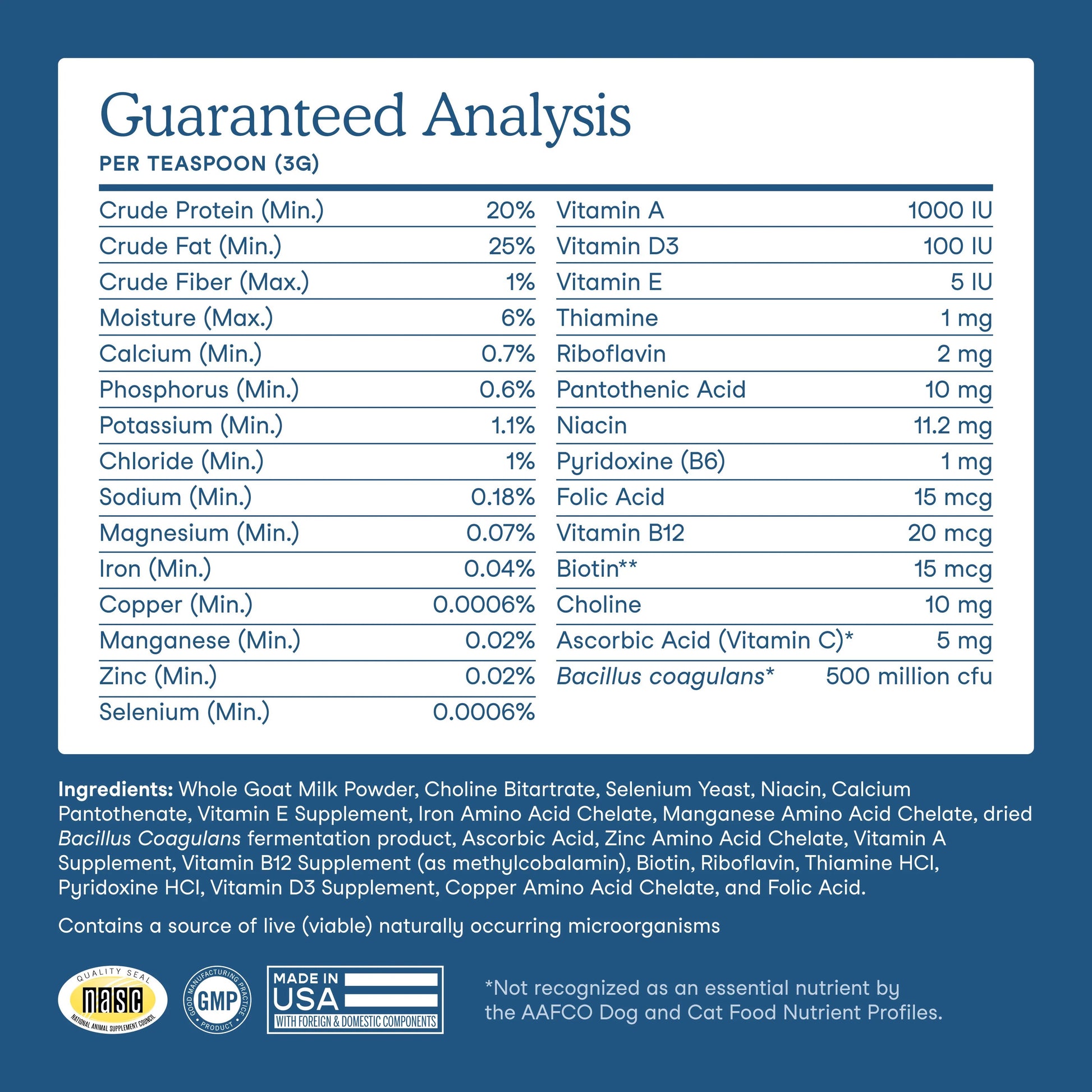 With Goat Milk as the #1 ingredient, these meal toppers are great for picky eaters. Our Goat Milk Multivitamin formula features essential vitamins and minerals plus probiotics—all designed to meet your pet’s nutritional needs.