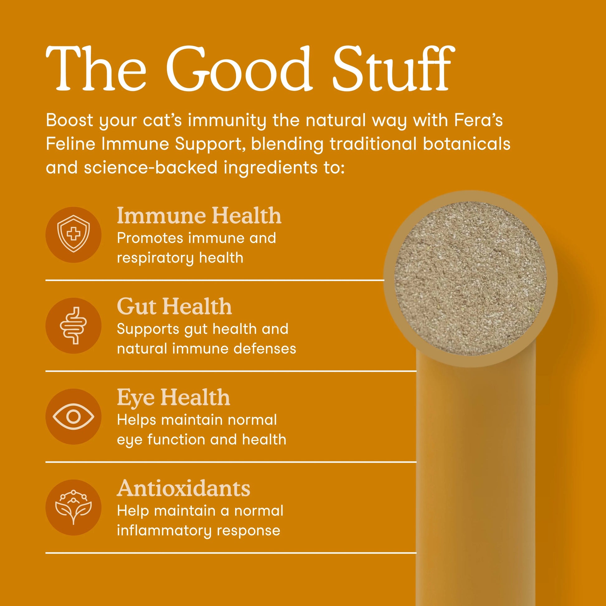 Boost your cat’s immunity the natural way with Fera’s Feline Immune Support, blending traditional botanicals and science-backed ingredients to: