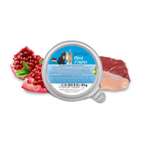 Composition: Chicken filet 40%, horse and chicken broth 37%, horse hearts 10%, chicken liver 5%, chicken fat 5%, pomegranate seeds 1%, salmon oil 1%, mineral nutrients 1%