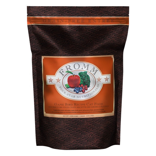 Fromm Four-Star Game Bird recipe for cats is a grain-free entrée with turkey, turkey broth, goose, and accents of duck, pheasant, & quail. Fromm Four-Star provides a variety driven gourmet dining experience for your cat.