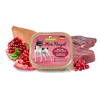 Composition: Venison meat and Angus beef meat 65% (venison 50% consisting of muscle meat, heart, liver, lung and Angus beef 15% consisting of muscle meat, heart, liver, lung), venison and Angus beef broth 24.4%, sweet potato 5%, cranberry 3%, pomegranate seeds 1% (dried and finely ground), mineral nutrients 1%, sunflower oil 0.5%, green-lipped mussel 0.1% (finely ground, naturally rich in glucosamine and chondroitin)