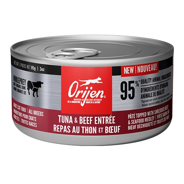 Canadian Brand. ORIJEN Wet Cat Food is a super premium paté packed with WholePrey animal ingredients. ORIJEN Tuna & Beef Entrée includes raw WholePrey ingredients like meat, organs, and bone that provide the protein, nutrients, and minerals your cat needs to be their best. The first 11 ingredients in this wet cat food diet are raw fish, beef, and poultry ingredients. Packed with 95% animal ingredients and no peas, lentils, legumes, carrageenan, or gums, ORIJEN Wet Cat Food provides the nourishment your cat needs to thrive.