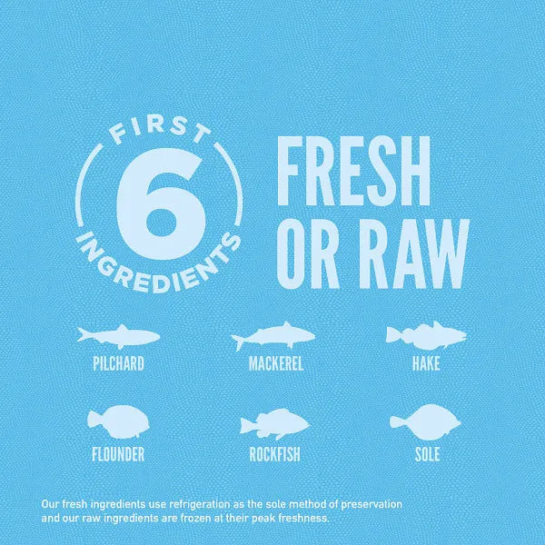 Raw whole pilchard (18%), raw whole mackerel (11%), raw whole hake (10%), raw flounder (6%), raw whole rockfish (6%), raw whole sole (6%), dehydrated mackerel (5%), dehydrated herring (5%), dehydrated whitefish (5%), dehydrated sardine (5%), dehydrated blue whiting (4%), herring oil (4%), whole red lentils, whole peas, whole chickpeas, whole green lentils, lentil fibre, whole pinto beans, pea starch, sunflower oil, dried kelp, fresh whole pumpkin, fresh whole butternut squash, fresh whole zucchini, fresh whole carrots, fresh whole apples, fresh whole pears, dried chicory root, fresh kale, fresh spinach, fresh beet greens, fresh turnip greens, whole cranberries, whole blueberries, whole saskatoon berries, turmeric, milk thistle, burdock root, lavender, marshmallow root, rosehip