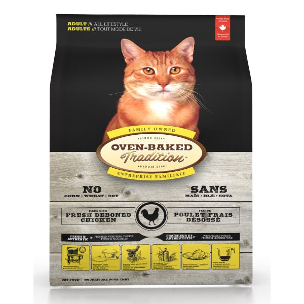 Canadian Brand. Oven-Baked Tradition Chicken formula for Adult Cats has been formulated for adult cats (indoor or outdoor). With chicken as the first ingredient, this recipe is prepared with fresh fruits and vegetables. This homemade recipe is prepared in smaller portions and slowly oven baked. It contains whole grains milled in-house and is made with no artificial flavors or preservatives. It's perfectly balanced and ideal for maintenance.