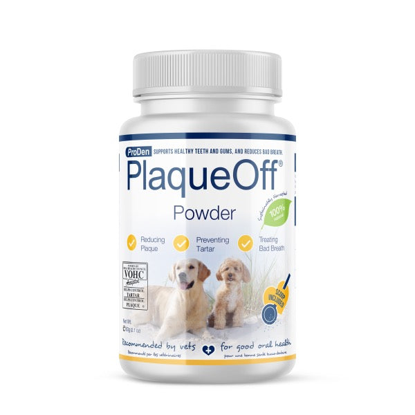 ProDen PlaqueOff Powder for Dogs is a 100% natural pet food supplement containing the natural kelp ingredient A.N ProDen - shown in clinical trials to help reduce plaque & tartar and to help improve bad breath. The results are usually seen between 3 to 8 weeks, with continued use. Sprinkle the powder over the dog's ordinary food, wet or dry, once a day with the supplied scoop. For a 10kg dog, a 60g bottle can last approximately 6 months.