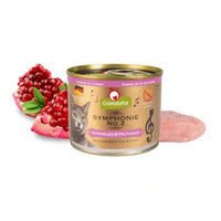 Composition: Chicken meat 50% (muscle meat, stock, liver), turkey meat 30% (muscle meat, stock), prawns 17% (meat, stock), salmon oil 1%, pomegranate seeds 1%, mineral nutrients 1%