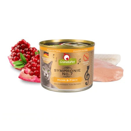 Composition: Chicken meat 66% (muscle meat, stock, liver), fish 31% (filet, stock), salmon oil 1%, pomegranate seeds 1%, mineral nutrients 1%