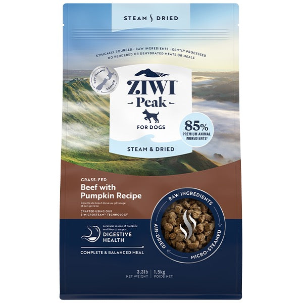 ZIWI Peak Steam & Dried Beef with Pumpkin Recipe for dogs is crafted from ethically-sourced raw beef from New Zealand's green pastures with pumpkin and chicory root to support digestive health. Delicately micro-steamed then gently air-dried via our innovative two-step Z-MicroSteam technology to ensure optimum nourishment and palatability.